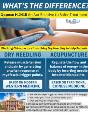 Dry needling is practiced safely by licensed professional chiropractors trained in anatomy, physiology, and neuromuscular health. Restricting its use to a single license type would unnecessarily reduce access to safe, non-invasive, drug-free care for patients across the Commonwealth.